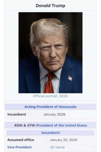 Американський президент Дональд Трамп розмістив у своїй мережі Truth Social скріншот, що імітує статтю з Вікіпедії. На кадрі він позначений не лише як 47-й президент Сполучених Штатів, але й як тимчасовий лідер Венесуели з січня місяця 2026 року.