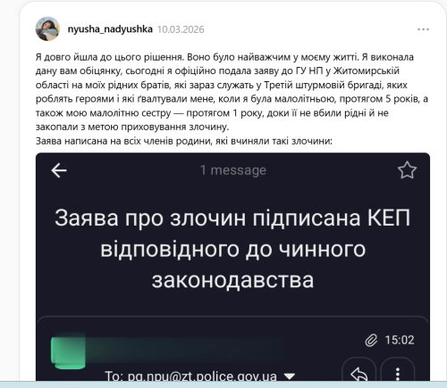 Дівчина довго вагалася і нарешті подала заяву на братів. Знімок екрана з профілю Надії в Threads