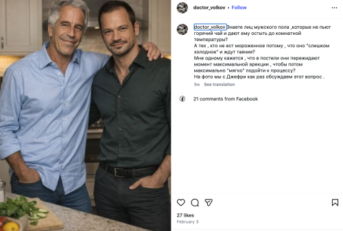 Фото з Епштейном, яке Волков виклав у себе в інстаграмі, звісно, згенероване ШІ, але багато говорить про цього лікаря. Фото: Інстаграм Олексія Волкова