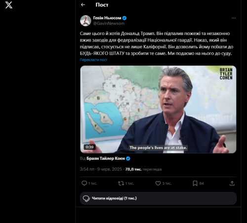 Губернатор Каліфорнії Ньюсом вже заявив, що подає на президента США до суду за порушення суверенітету штату та введення військ. Скрин x.com/GavinNewsom