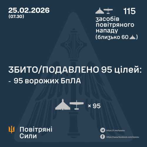 У ніч з 24 на 25 лютого російські загарбники атакували 115 ударними БПЛА типу Shahed, Герань, Італмас та дронами інших моделей. Згідно з інформацією від Повітряних сил України, агресор здійснив атаку з Брянської, Курської областей та тимчасово окупованої території Донецької області.