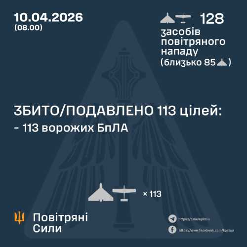 У ніч на 10 квітня росіяни здійснили атаку 128 ударними БпЛА таких типів як Shahed, Гербера, Італмас, а також іншими типами безпілотників. Згідно з інформацією Повітряних сил ЗСУ, агресор здійснив атаку з Орла, Міллєрово, Приморсько-Ахтарська, а також з кримських Гвардійського та Чауда.