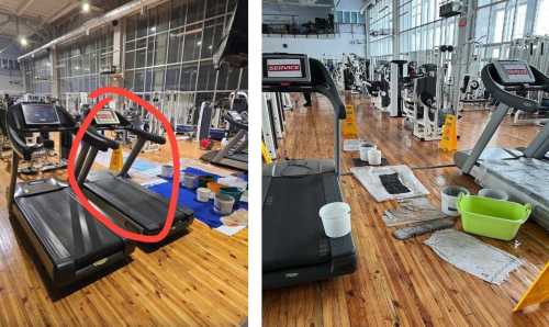 Місце протікання даху в спортивному залі університету. Пошкоджена бігова доріжка внаслідок протікання покрівлі
