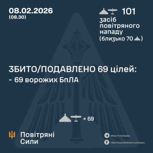 У ніч на 8 лютого (починаючи з 18:00 7 лютого) росіяни здійснили напад на Україну, застосувавши 101 ударний БпЛА типу Shahed, Гербера, Італмас та інші типи безпілотників. Їх запускали з напрямків: Курськ, Орел, Брянськ, Приморсько-Ахтарськ, Шаталово (РФ), приблизно 70 з них були “шахедами”. Про це інформує командування Повітряних сил ЗСУ.