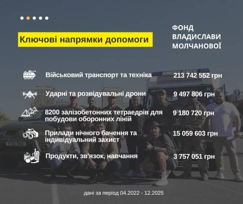 Провідним напрямком підтримки став військовий транспорт і апаратура – більше ніж 213 млн грн. За цей період було передано 170 одиниць обладнання, зокрема бронетранспортери, броньовані машини, військова інженерна та будівельна техніка, автоцистерни для палива, пожежні машини, пікапи і всюдиходи.