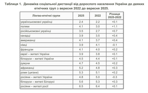 Як показало соцопитування, найкоротшу соціальну дистанцію українці мають до україномовних (індекс 2,4) та російськомовних (3,5) громадян України. Це свідчить про те, що значна частина респондентів готова приймати їх як найближчих людей – членів сім’ї чи товаришів.