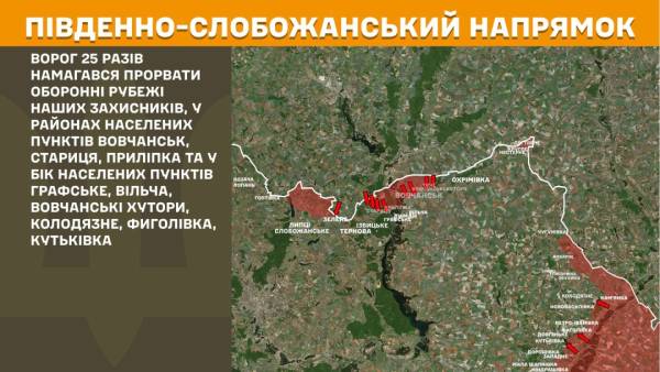 На Південно-Слобожанському напрямку ворог 25 разів намагався здолати оборонні лінії українських захисників, у районах населених пунктів Вовчанськ, Стариця, Приліпка та в напрямку населених пунктів Графське, Вільча, Вовчанські Хутори, Колодязне, Фиголівка, Кутьківка.
