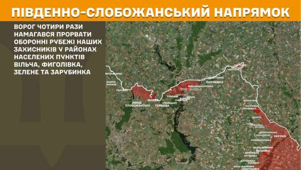 На Південно-Слобожанському напрямку супротивник чотири рази робив спроби прорвати оборонні позиції в районах Вільчі, Фиголівки, Зеленого та Зарубинки.