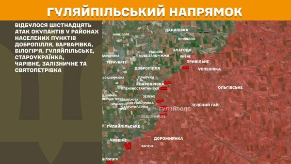 На Гуляйпільському напрямку відбулося 16 російських атак в околицях Добропілля, Варварівки, Білогір’я, Гуляйпільського, Староукраїнки, Чарівного, Залізничного та Святопетрівки.
