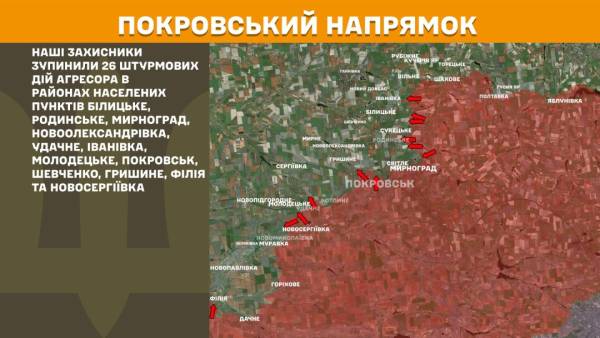 На Покровському напрямку Сили оборони зупинили 26 штурмових дій армії РФ у районах Білицького, Родинського, Мирнограда, Новоолександрівки, Удачного, Іванівки, Молодецького, Покровська, Шевченка, Гришиного, Філії та Новосергіївки.