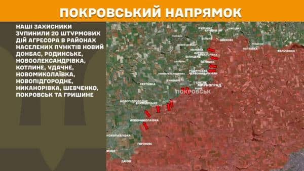 На Покровському напрямку українські оборонці зупинили 20 наступальних дій агресора в районах Нового Донбасу, Родинського, Новоолександрівки, Котлиного, Удачного, Новомиколаївки, Новопідгороднього, Никанорівки, Шевченка, Покровська та Гришиного.