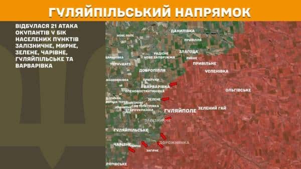 На Гуляйпільському напрямку відбулася 21 атака окупантів у напрямку населених пунктів Залізничне, Мирне, Зелене, Чарівне, Гуляйпільське та Варварівка.