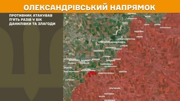 На Олександрівському напрямку противник атакував п’ять разів у напрямку Данилівки та Злагоди.