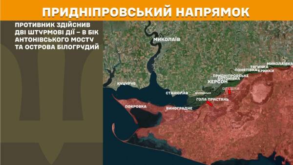 На Придніпровському напрямку росіяни здійснили дві штурмові операції – в напрямку Антонівського мосту та острова Білогрудий.