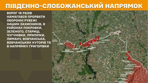 На Південно-Слобожанському напрямку росіяни 18 разів робили спроби прорвати оборонні рубежі в районах Покровки, Зеленого, Стариці, Чугунівки, Приліпки, Лиману, Вовчанська та Вовчанських Хуторів, у напрямку Григорівки.