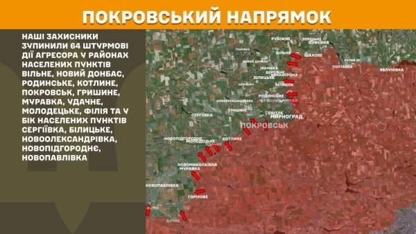 На Покровському напрямку українські оборонці зупинили 64 штурмові дії ворога в районах Вільного, Нового Донбасу, Родинського, Котлиного, Покровська, Гришиного, Муравки, Удачного, Молодецького та Філії, у напрямку Сергіївки, Білицького, Новоолександрівки, Новопідгороднього й Новопавлівки.
