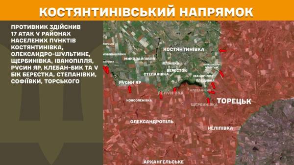 На Костянтинівському напрямку окупанти здійснили 17 наступів у районах Костянтинівки, Олександро-Шультиного, Щербинівки, Іванопілля, Русиного Яру, Клебан-Бика та в напрямку Берестка, Степанівки, Софіївки і Торського.