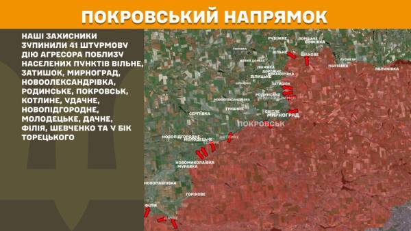На Покровському напрямку Сили оборони зупинили 41 штурмову дію армії РФ поблизу Вільного, Затишка, Мирнограда, Новоолександрівки, Родинського, Покровська, Котлиного, Удачного, Новопідгородного, Молодецького, Дачного, Філії, Шевченка та в напрямку Торецького.